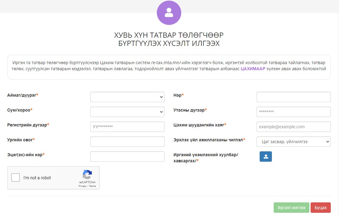 Иргэн ТАТВАР ТӨЛӨГЧӨӨР БҮРТГЭЛГҮЙ бол Цахим татварын системд бүртгэл үүсгэхийн тулд ЦАХИМ ТАТВАРЫН СИСТЕМ-ийн ТАТВАР ТӨЛӨГЧӨӨР БҮРТГҮҮЛЭХ хэсэгт ХУВЬ ХҮН товчийг дарснаар бүртгүүлэх цонх гарч ирнэ.